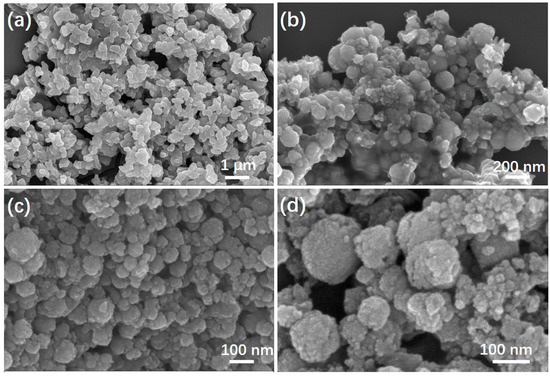 SEM images of (a) Ni-MOFs; (b) NiS2/C; (c,d) Fe-NiS2/C-30.