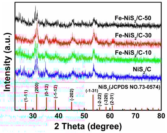 As for the precursor Ni-MOFs, i.e., [CH3CH3NH2][Ni(HCOO)3], they are crystalline (Figure S1) and show a spindle-like particle morphology, with a predominant length in the range of 100–500 nm (Figure 1a and Figure S2a,b). After solvothermal treatment in the presence of TAA at 120 °C for 6 h, Ni-MOFs were carbonized and concurrently vulcanized, leading to a composite of NiS2 and carbon, i.e., NiS2/C (Figure 1b), with a particle morphology resembling to the parent Ni-MOFs. Further doping NiS2/C with ferric ions through a secondary solvothermal treatment makes the NiS2/C composite nanoparticles become rougher (Figure 1c,d), without an apparent change to the size of the nanoparticles (Figure S2c,d). From the corresponding XRD profiles depicted in Figure 2, one can find that after the first solvothermal treatment, the resulting NiS2/C sample shows distinct peaks at 2θ = 31.4°, 35.3°, 38.8°, 45.1°, 53.4°, 58.5°, and 60.9°, corresponding to the (200), (0–12), (−1–12), (–202), (−1–31), (−2–22), (−320), and (2–31) planes of triclinic phase NiS2 (JCPDS no. 73-0574). These observations signify that solvothermal treatment in the presence of TAA successfully vulcanizes the Ni-MOFs, and leads to the formation of phase-pure triclinic NiS2. After a secondary solvothermal treatment in the presence of FeCl3, Fe was indeed doped into the lattices of triclinic phase NiS2, as supported by the observation of the Fe signal in the EDS measurements (Figure S3). Meanwhile, one can find that he introduction of Fe, herein 30 wt% in the precursor, causes no apparent change to the crystalline phase probably due to that the atomic radius of Fe3+ (0.055 nm) is close to that of Ni2+ (0.069 nm) [7,25,26], as signified by the results that the corresponding XRD peaks in both Fe-NiS2/C-30 and NiS2/C samples appeared at identical positions (Figure 2). After careful comparison, it is found that the crystallinity of NiS2 phase in Fe-NiS2/C-30 is obviously higher than that in NiS2/C sample, probably due to the double solvothermal treatments, i.e., longer solvothermal treatment time for NiS2 crystallization.