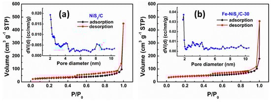 The N2 adsorption-desorption isotherms of NiS2/C and Fe-NiS2/C-30 are shown in Figure 4, and one can find that they are type IV isotherms with a well-developed H3-type hysteresis loop (P/P0 > 0.4). The initial part (0 < P/P0 < 0.4) of the type IV isotherm is attributed to monolayer-multilayer adsorption and the hysteresis appearing in the multilayer range of physisorption isotherms is usually associated with capillary condensation in pore structures [27,28]. The BET specific surface area was evaluated to be 107 m2 g−1 for NiS2/C (Figure 4a), 141 m2 g−1 for Fe-NiS2/C-10 (Figure S5a), 150 m2 g−1 for Fe-NiS2/C-50 (Figure S5b) and 158 m2 g−1 for Fe-NiS2/C-30 (Figure 4b), respectively. The corresponding pore diameter distribution plots were inset to each panel in Figure 4 and Figure S5, where one can find that NiS2/C and Fe-NiS2/C-X samples consist of hierarchical pore structures, with both micropores (< 2.0 nm) and mesopores of 2.0~10.0 nm. As is well documented, mesopores are beneficial to the mass/ions diffusion and transport process and, hence, the presence of abundant mesopores may improve the electrochemical reaction kinetics [24]. It is evident that the introduction of Fe to the lattices of NiS2 can enhance the specific surface area, and it is most likely that the introduction of heteroatom Fe to the lattices of NiS2 causes structural defects although the radius of Fe3+ close to that of Ni2+ [29] and, hence, impedes the growth of large-scale NiS2 crystals, which finally leads to an increased surface roughness for Fe-NiS2/C-30 (Figure 1c,d), as compared with NiS2/C (Figure 1b). This is supported by the results from Figure 1c,d, where although the crystallinity of NiS2 in Fe-NiS2/C-30 sample is much higher than that in NiS2/C sample (Figure 2), their crystalline domain sizes are highly comparable (Figure 1b,c). Note that the specific surface area is closely correlated to the electrochemically surface area (ECSA). A large specific surface area can maximize the exposure of active components for better catalytic activity.