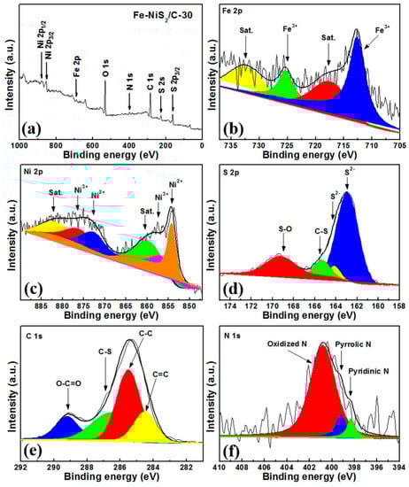XPS (a) survey spectra and high-resolution spectra of (b) Fe 2p, (c) Ni 2p, (d) S 2p, (e) C 1s, and (f) N 1s for the Fe-NiS2/C-30 sample.