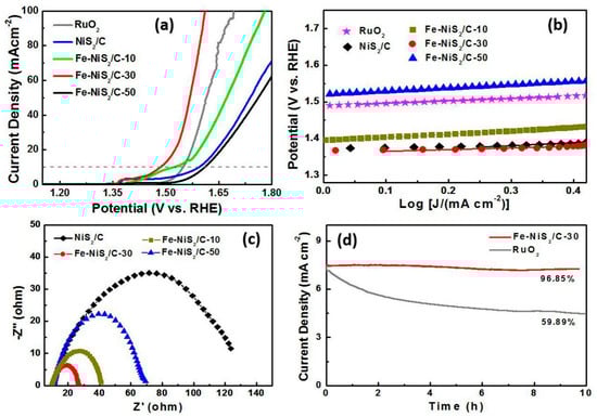 The OER performance for the above series samples were evaluated in O2-saturated alkaline medium (1.0 M KOH) with a typical three-electrode cell setup. For comparison, commercial RuO2 was also investigated under the identical experimental conditions. To mitigate the iR loss from electrolyte resistance, the LSV curves were corrected on the basis of electrical impedance spectroscopy. As shown in Figure 6a, when the potential is positively swept from +1.300 V to +1.800 V (vs. RHE), the anodic current rapidly increases for all the investigated samples, suggesting the appearance of OER. As for Fe-NiS2/C-30, a potential of +1.486 V (vs. RHE) is required to reach a current density of 10 mA cm−2, which is much lower than the +1.594 V (vs. RHE) for NiS2/C, +1.526 V (vs. RHE) for Fe-NiS2/C-10, +1.611 V (vs. RHE) for Fe-NiS2/C-50, as well as +1.550 V (vs. RHE) for commercial RuO2 catalyst. These observations suggest that the Fe-NiS2/C-30 sample shows the best OER catalytic activity among the series.