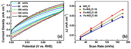 (a) Cyclic voltammograms recorded within the potential range of +0.600–0.700 V (vs. RHE) for the Fe-NiS2/C-30 sample. (b) The plots of current density difference (ΔJ = ja − jc) at +0.650 V (vs. RHE) against the potential scan rate. The linear curves are the corresponding linear fittings for evaluating Cdl.
