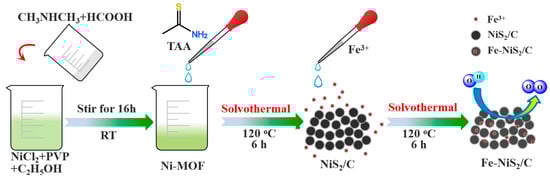 Schematic illustration of the preparation of Fe-NiS2/C samples.