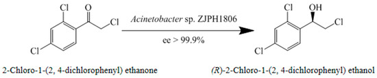 To replace the above racemates, single enantiomers can be produced by chemical methods. de Mattos reported that rhodium, ruthenium, and iridium were the most popular catalysts in the hydrogenation of ketones. Sharpless dihydroxylation and oxazaborolidine catalysts were also used to synthesize enantiomerically enriched single enantiomers [4]. Zhang sought to provide an industrialized production method for (R)-2-chloro-1-(2,4-dichlorophenyl) ethanol using borane complexes and diphenyl proline in organic solvents, with 2-chloro-1-(2,4-dichlorophenyl) ethanone as the substrate; the reaction was able to achieve a yield of 92.4% with 99.3% enantiomeric excess (ee) [5]. Luo et al. presented their chemical method using ruthenium and (1S, 2S)-(+)-N-(4-toluenesulfonyl)-1, 2-diphenylethylenediamine to reduce 2-chloro-1-(2,4-dichlorophenyl) ethanone, achieving 96.4% yield and 99.2% ee [6]. The enantioselectivity of the product is related to the complexity of the ligands. Some transition metals need additional enantiomeric ligands to achieve high enantioselectivity, and the cost of transition metals limit the use of industrialization processes [7].