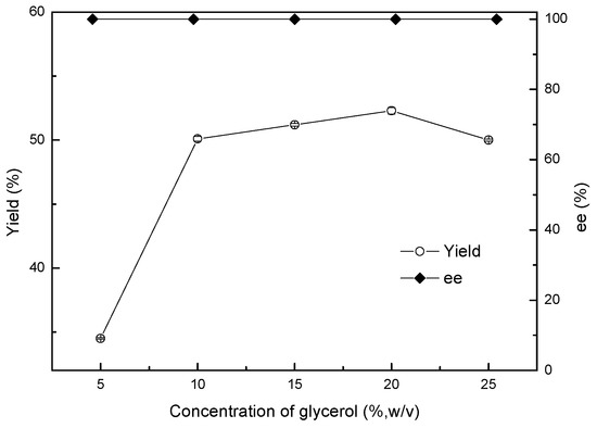 Various glycerol concentrations, ranging from 5% to 25% (w/v), were used to improve the asymmetric reduction of 2-chloro-1-(2,4-dichlorophenyl) ethanone to (R)-2-chloro-1-(2,4-dichlorophenyl) ethanol with the Acinetobacter sp. ZJPH1806 as biocatalyst. As shown in Figure 5, the yield rose remarkably with an increase in the glycerol concentration of up to 20% (w/v). Following that, the concentration of glycerol was further increased, decreasing the efficiency of the reaction. This reduction may be due to glycerol’s high viscosity causing problems in transfer efficiency [18]. Asami’s results coincide with the above research, in that glycerol can be used to regenerate cofactors in the bioreduction of 1-[3,5-bis(dimethylcarbamoyloxy)phenyl]-2-chloroethanone by Williopsis californica JCM 3600 [19].