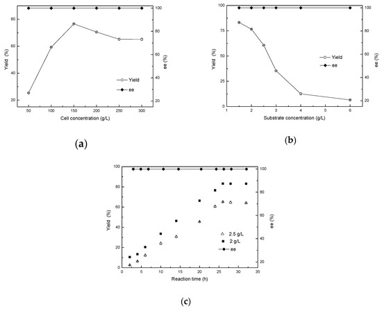 Effects of cell concentration (a), substrate concentration (b), and reaction time (c) on the asymmetric reduction.