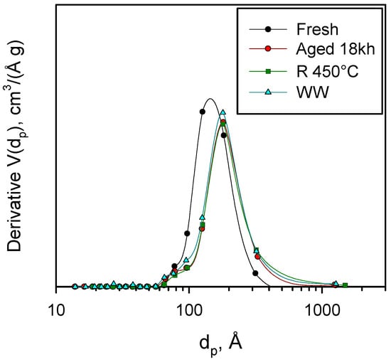 Table 2). This is possibly caused by the volatilization/decomposition of some species formed and/or condensed on the catalyst during prolonged SCR operation. Nevertheless, the pore size distribution did not significantly change with respect to the aged catalyst (