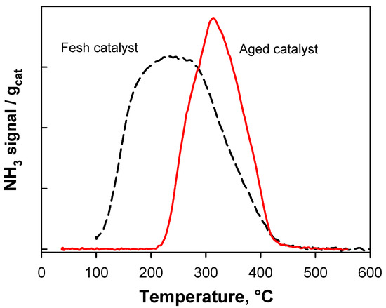 Figure 4), shows a more intense signal starting at about 210 °C, with a peak at 315 °C, and ending at the same temperature observed for the fresh catalyst. The ammonia adsorbed on the aged catalyst derived from its operation in the SCR reactor. Therefore, from the onset temperature of desorption, it can be argued that the last temperature the catalyst experienced in the SCR reactor was around 210 °C. The total amount of desorbed ammonia was lower (0.075 mmol/g) than the amount desorbed from the fresh sample due to the lack of NH