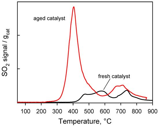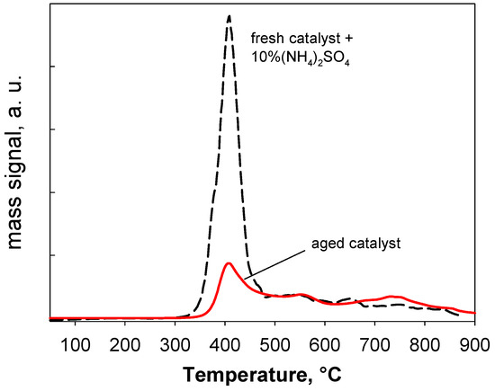 6]. In agreement with this assertion, the aged catalyst performed worse than its fresh counterpart up to 300 °C; however, during those SCR tests at higher temperatures, ammonium (bi) sulfates started to be desorbed and decomposed (also by reaction with NO [