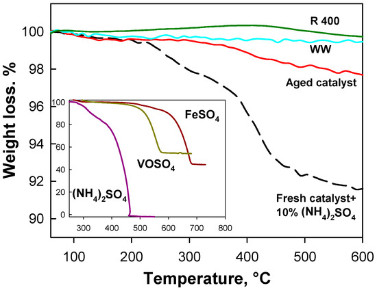 Figure 6, the weight loss followed the same qualitative trend observed for the aged catalyst. Therefore, it can be argued that ammonium sulfate was one of the main species accumulated on the catalyst during 18 kh of SCR operation at low temperature. Its total amount on the catalyst accounted for a maximum of 1–1.5% wt. and it could be removed by either thermal regeneration treatments at temperatures above 400 °C or by washing with water.