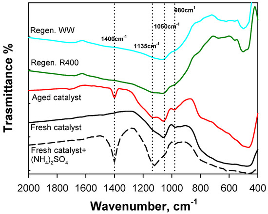 Figure 8, the FTIR spectra of the fresh, aged and regenerated catalysts are reported. The fresh catalyst showed, in addition to the small band at 980 cm