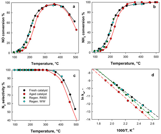 Figure 9c), but, for higher temperatures, the aged catalyst showed a more pronounced tendency to form N