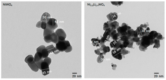 TEM images of NiWO4 and Ni0.8Li0.4WO4 particles.
