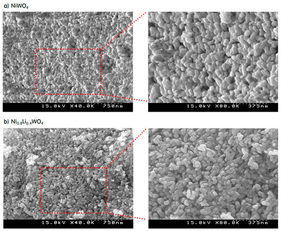 In order to observe the surface morphology of the prepared particles, SEM (Scanning electron microscope) images of the NiWO4 and Ni0.8Li0.4WO4 particles were acquired, as shown in Figure 4. The NiWO4 particles were strongly aggregated, which caused the surfaces of the particles to be sintered to each other. However, the image of Ni0.8Li0.4WO4 shows that the particles were separated from each other, with a gap between the particles, and no surface sintering due to aggregation occurred. Thus, it is expected that more of the reaction gases will be adsorbed on the surface of the Ni0.8Li0.4WO4 particles with gaps than on the surface of the dense NiWO4 particles during the reaction. The size of the Ni0.8Li0.4WO4 particles was slightly smaller than that of the NiWO4 particles, as already mentioned in relation to the TEM image.