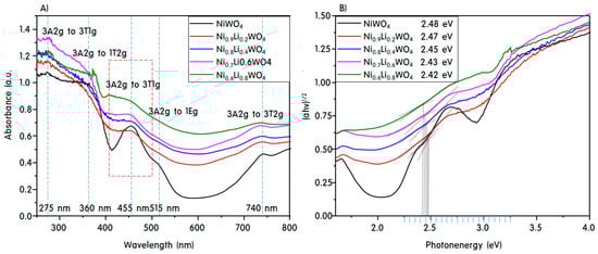 Figure 5 displays the ultraviolet-visible diffuse reflectance spectra (UV-vis DRS) A) and Tauc plots B) of the NiWO4 and Ni1-xLi2xWO4 particles, which were used to determine their bandgaps. According to de Oliveira et al. [32], NixWOy has absorption bands at 1.48, 1.67, 2.74, and 3.7 eV due to the transitions from the 3A2g state to the 3T2g, 1Eg, 3T1g, 1T2g and 3T1g excited states, respectively. In the present work, absorbance maxima were observed at 740 nm (1.68 eV), 515 nm (2.40 eV), 455 nm (2.73 eV), 360 nm (3.44 eV), and 275 nm (4.50 eV) (Figure 5A), where the first two low-intensity bands correspond to the blue range and the high intensity fourth and fifth bands are in the ultraviolet range. The middle band is located in the visible range. These bands were assigned to Ni2+ and charge transfer between clusters [33]. The bands at 2.40 and 3.44 eV are assigned to the forbidden electronic transitions from 3A2g to 1Eg and 1T2g, respectively, and the last band at 4.50 eV is related to a charge transfer transition [34]. During the electronic transition, an oxygen 2p electron moves into one of the empty tungsten 5d orbitals. Thus, the band at 2.73 eV could be assigned to the 3A2g to 3T1g transition in the Ni2+ crystals. Additionally, it was concluded that the band at 1.68 eV is assigned to the presence of Ni2+Ox, indicating that Frenkel defects are present in NiWO4, with the dislocation of Ni2+ from octahedral to tetrahedral sites [35]. In particular, as the amount of Li+ added increased, the number of defects became larger. As the amount of Li+ increased, the forbidden peaks disappeared, leaving only three specific absorption peaks that were slightly shifted toward a longer wavelength. On the other hand, as shown in Figure 5A, the bandgap was specified as the maximum point, whereas in Figure 5B, the Tauc plot was drawn to ensure accuracy of the bandgap. An extension line from the tangent line was drawn by extrapolation to the third absorption peak for all samples, and the vertex of the cross with the horizontal line was found. The point was drawn down along the x axis to determine the bandgap. Thus, it was concluded herein that the bandgaps of NiWO4, Ni0.9Li0.2WO4, Ni0.8Li0.4WO4, Ni0.7Li0.6WO4, and Ni0.6Li0.8WO4 were 2.48, 2.47, 2.45, 2.43, and 2.42 eV, respectively, which corresponds to 3A2g to 3T1g absorptions as determined from the Tauc plot presented in Figure 5B. Generally, it is known that as the bandgap of a catalyst becomes narrower, electrons can be easily excited by weak light, thereby increasing the initial photocatalytic activity.
