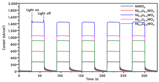 In general, photocatalytic activity is known to be promoted by effective separation of charge [39]. If the excited electrons flow well on the surface of the catalyst, charge separation between the electrons and holes will be adequate, which helps to maintain the redox reaction in the VB and CB. Analysis of the photocurrent density is the method for measuring the degree of current flow on the catalyst surface; the corresponding data are presented in Figure 7. A larger current density means that more electrons flow through the surface without recombining with the holes. For NiWO4, the current density was 250 nA cm−2 after the 5th cycle. The current density increased with increasing Li+ ion doping, and reached the maximum of 450 nA cm−2 at Ni0.8Li0.4WO4, followed by a decrease. From these results, we predicted that Ni0.8Li0.4WO4 with the highest current density should exhibit the best photocatalytic activity. The results are also consistent with the PL results in Figure 6.