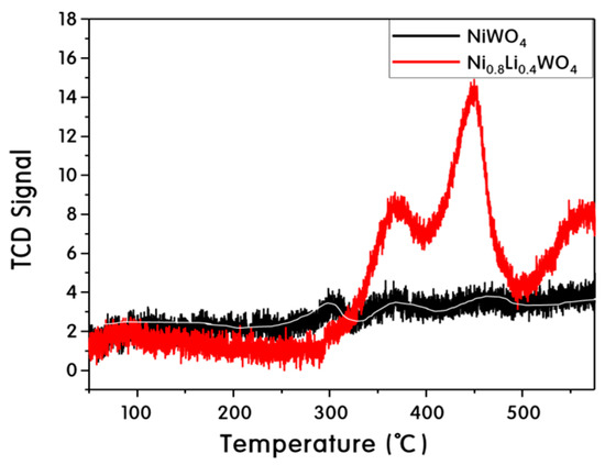 Figure 8 shows the CO2 gas-adsorption capacity of the NiWO4 and Ni0.8Li0.4WO4 particles. The particles were treated at 300 °C for 30 min to remove impurities, and CO2 gas was adsorbed at 50 °C for 2 h. The temperature was increased to 550 °C at a rate of 10 °C min−1 to determine the desorption amount. For pure NiWO4, small desorption peaks appeared near 300, 380, and 470 °C, but were difficult to distinguish from the noise. However, the desorption peaks were surprisingly large at 380 and 450 °C for the Ni0.8Li0.4WO4 particles. Plausibly, the amount of CO2 gas adsorbed increased with increasing Li+ content. The incorporation of Li+ into the lattice increases the amount of oxygen vacancies in the lattice due to charge balancing. It was concluded that more oxygen vacancies provided more attractive areas for CO2 gas in the particles.