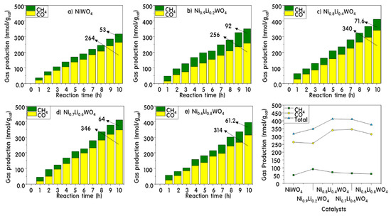 CH4 and CO product distributions during CO2 photoreduction over NiWO4 (a) and Ni1-xLi2xWO4 (b–e) catalysts.