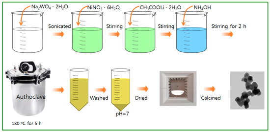 The NiWO4 and Ni1-xLi2xWO4 particles were prepared by using a typical hydrothermal method, as shown in Figure 10. For the sol-mixtures, nickel nitrate (Ni(NO3)2·6H2O, 99.99%, Junsei Chem., Tokyo, Japan), sodium tungstate (Na2WO4·2H2O, 99.99%, Junsei Chem., Tokyo, Japan), and lithium acetate (CH3COOLi·2H2O, 99.99%, Junsei Chem., Tokyo, Japan) were used as the Ni, W, and Li precursors, respectively. As the first step for NiWO4 synthesis, Na2WO4·2H2O (1.0 mol) was dissolved in distilled water (600 mL), and after sonication for 10 min, Ni(NO3)2·6H2O (1.0 mol) was dropped in the mixed solution with stirring. NH4OH was added to the mixture in the next step to fix the pH at 9.0, and the solution was stirred to homogeneity for 2 h. The final solution was moved to an autoclave for thermal treatment at 180 °C for 5 h under a nitrogen environment. After thermal treatment, the resulting precipitate was washed with deionized water and ethanol several times and dried at 80 °C for 24 h. Finally, the obtained power sample was calcined in air at 600 °C for 6 h for crystallization. As the second step for the synthesis of Ni1-xLi2xWO4, the process was carried out as for the synthesis of NiWO4, but the atomic molar percentages of Li and Ni ions in the starting materials was adjusted to Ni:Li = 0.9:0.2, 0.8:0.4, 0.7:0.6, and 0.6:0.8, corresponding to 1.0 mol of W ions. Consequently, five kinds of particles, represented as NiWO4, Ni0.9Li0.2WO4, Ni0.8Li0.4WO4, Ni0.7Li0.6WO4, and Ni0.6Li0.8WO4, were synthesized in this study.