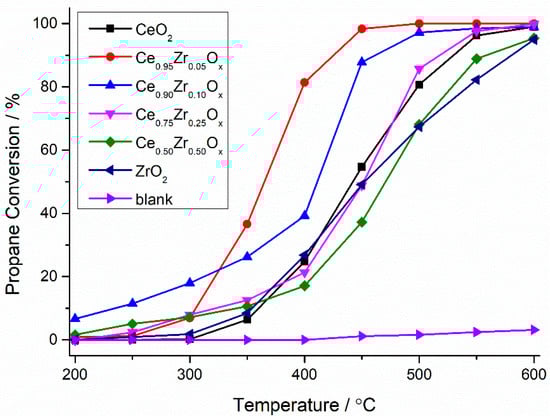 The catalytic activity of ceria–zirconia mixed metal oxide catalysts for the total oxidation of propane is shown in Figure 1. Only 6% of the propane was converted at 600 °C in an empty reactor, indicating that contribution from gas phase homogeneous reactions was negligible. All catalysts demonstrated appreciable propane total oxidation activity, with a high selectivity to CO2 (>99%). The ceria showed 100% propane conversion at 600 °C, whereas zirconia did not reach total conversion. The higher activity noted for the ceria compared to the zirconia can be attributed to the enhanced ability of ceria to activate C–H bonds as compared to zirconia [26]. Only one ceria–zirconia mixed metal oxide had lower propane total oxidation activity than the ceria, the Ce0.50Zr0.50Ox, and the order of catalytic activity was: