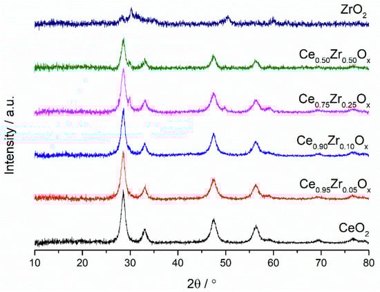 Powder XRD patterns of the ceria–zirconia mixed metal oxide catalysts prepared from carbonate precursors.