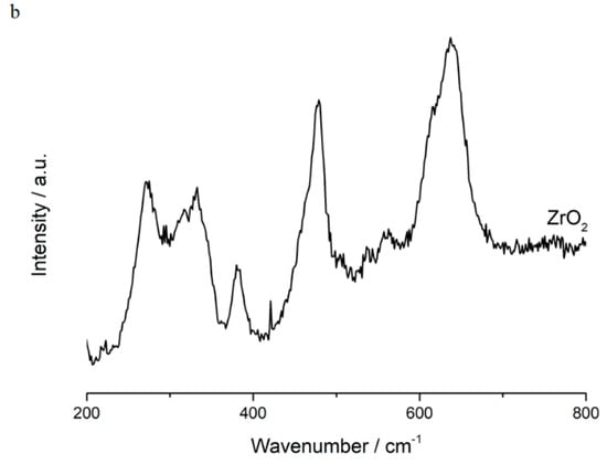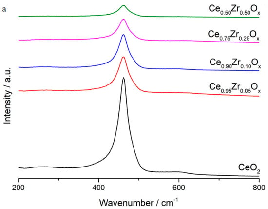 The ceria–zirconia catalysts were characterized using laser Raman spectroscopy (Figure 4). Only one Raman mode, centered at 464 cm−1, was observed for the ceria, which is characteristic of the cubic fluorite phase (F2g) [27]. The zirconia had five weak Raman active modes centered at 247 cm−1, 307 cm−1, 464 cm−1, 596 cm−1, and 626 cm−1, which are characteristic of the tetragonal zirconia phase (A1g + 3Ee + B1g). This confirms the XRD analysis, in which only one phase was observed for both single metal oxides.