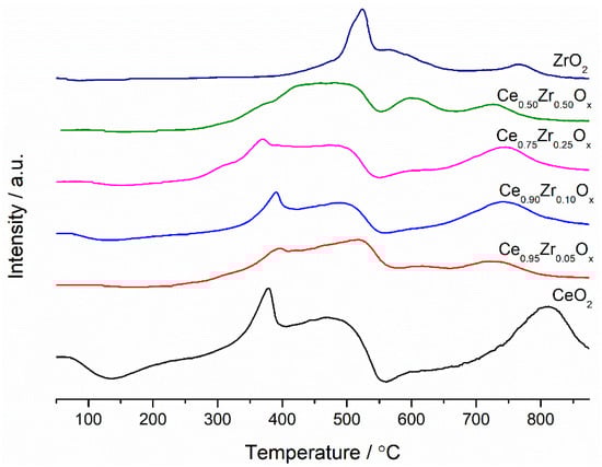 Reduction profiles of the ceria–zirconia mixed metal oxides are shown in Figure 5. The ceria had two reduction regions, one at approximately 500 °C and the second at 800 °C, which attributed to surface reduction and bulk reduction, respectively. Two peaks were noted for surface reduction of the ceria, suggesting that Ce3+ and Ce4+ were both present on the surface of the ceria. As Ce4+ is easier to reduce than Ce3+, the first surface reduction region can be assigned to the Ce4+ and the higher temperature region to Ce3+ [36]. The zirconia had two reduction peaks, at 540 °C and 735 °C, assigned to the formation of surface hydroxide groups [41], and bulk zirconia reduction [42], respectively.