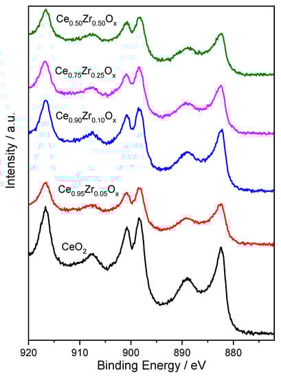 XPS spectra of the Ce 3d peaks for the ceria–zirconia mixed metal oxide catalysts prepared from carbonate precursors.