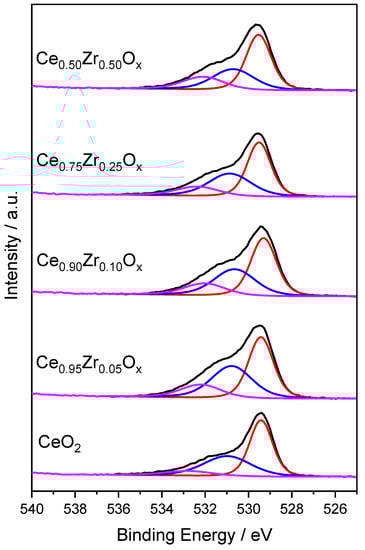 XPS spectra of the O 1s peaks of the ceria–zirconia mixed metal oxides prepared from carbonate precursors.