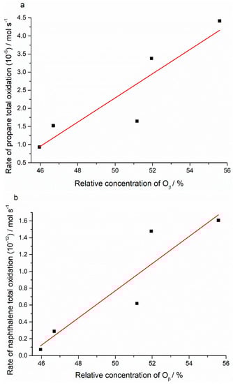The relationship between the relative concentration of surface Oβ and the activity for total oxidation of propane and naphthalene is shown in Figure 9. It has been reported previously that the relative concentrations of Oβ in copper-modified ceria catalysts correlate with its naphthalene total oxidation ability [44]. For both propane [45] and naphthalene [46], the process of catalytic total oxidation occurs via a Mars–van Krevelen mechanism, and the ease and extent of the oxygen removal from the lattice, i.e., its mobility, is key to catalyst activity [47]. These are controlled by surface oxygen species, oxygen vacancies, and other defect sites on the surface of the mixed metal oxide. The strong correlation between surface concentration of Oβ and the activity for both propane and naphthalene oxidation suggests that the surface defects are the key factor controlling catalyst activity.