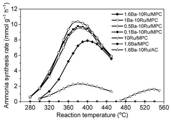 Carbon has been widely applied in industry for catalysis, adsorption, and electronic devices [22,23,24]. The pioneering works by Aika et al. demonstrated that ammonia synthesis over a carbon-supported Ru catalyst with alkali and alkaline earth elements added as promotors could be performed at a relatively low temperature and pressure (<400 °C, <0.1 MPa) [25,26]. However, the carbon-supported Ru catalysts were unstable during ammonia synthesis and became deactivated due to the methanation of carbon by dissociated hydrogen near the Ru active sites. Recently, it was shown that Cs-promoted Ru supported on activated carbon exhibited low activity for ammonia synthesis, [21] likely due to the Ru particle aggregation caused by methanation during ammonia synthesis. On the other hand, the promotion effect of the Ba species on the carbon-supported Ru catalysts for mild ammonia synthesis has been reported [27,28,29]. Rossetti et al. suggested that the barium oxide (BaO) was formed in the carbon-supported Ru catalysts and acted as an electronic promoter for ammonia synthesis [27,28]. Hansen et al. reported that formation of the B5 sites (i.e., steps) on the Ru surface are promoted by the BaOx species via electrostatic interaction and facilitate N2 dissociation [29]. Other studies argued that the Ba species acts as a structural promotor to create highly active sites on the Ru particles supported by carbon for ammonia synthesis [30,31]. The preparation of carbon-supported Ru catalysts with added promotors, which can efficiently and stably catalyze mild ammonia synthesis at a low temperature and pressure must be further investigated. In this research, we developed a series of novel mesoporous carbon-supported and Ba-promoted Ru catalysts for mild ammonia synthesis compared to several reference catalysts. The effects of the Ba promotor and mesoporous structure on the activity and stability of the Ba-promoted Ru/MPC catalysts were examined. The potential application of the 1.6Ba-10Ru-MPC catalyst for intermittent ammonia synthesis was reported for the first time.