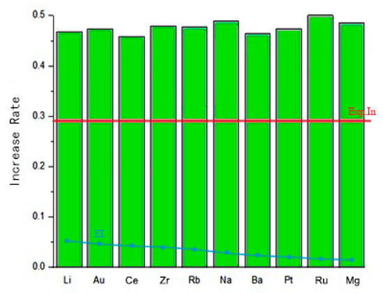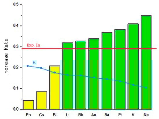 According to these results, it is apparent that three additive elements, namely, the Pb, Cs, and Bi, with resistance to sintering superior than one of Ni-In/Al2O3 catalysts, which were estimated to be candidates. However, this prediction was incorrect. The increase rate for Ni-Pb/Al2O3, Ni-Cs/Al2O3, and Ni-Bi/Al2O3 catalysts are higher than that of Ni-In/Al2O3 catalysts. Thereafter, additional experiments were carried out utilizing Pb, Cs, as well as Bi element for building the second regression model by GPR. In this context, as depicted by Figure 6, elements were ranked with respect to the EI. Through the prediction of the second regression model, it is found that among the remaining elements, adding Li has the best anti-sintering performance, and the detailed data are shown in Table 7. However, the experimental results reveal that the effect of adding Li is not as good as that of adding Cs; furthermore, its EI value is quite low. Consequently, the screening process was eventually finished.