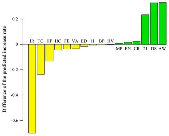 As indicated in Table 2, one of the physicochemical properties of Cs was selected to change from the minimum to the maximum of the performance of 63 elements. Accordingly, the six principal components and the growth rate predicted by GPR model were also changed. Consequently, the effect of the physicochemical property can be estimated. Difference of the predicted increased rate chosen here, that is, corresponding to the difference between 20% and 100% of the normalized physicochemical property, represented the influence of different physicochemical properties on the anti-sintering performance of the catalyst, by reason that the effects were monotonous. As can be seen in Figure 7, the effects of size factors, for instance, IR (ionic radii), DS (density), and AW (atomic weight) are large in the sintering resistance, while the effects of thermal properties such as HV (heat of vaporization), MP (melting point), BP (boiling point) are small. Particularly, IR (ionic radii) is an important factor to limit Ni sintering. The difference of the predicted increased rate obtained by calculation, whose absolute value greater than 0.6, is the largest of all values. In this manner, the influence of each property on the catalytic anti-sintering clearly showed that some properties are influential and others are not. Whereas how those different properties affect the anti-sintering performance is not revealed immediately, this should be clarified in further research.