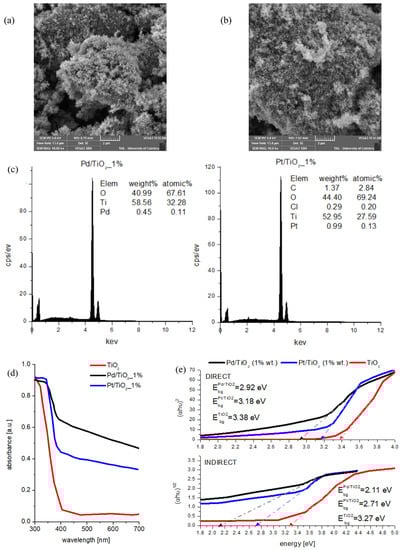 Characterization of TiO2 modified with Pd and Pt: (a) SEM image of 1% Pd/TiO2; (b) SEM image of 1% Pt/TiO2; (c) EDX spectra of 1% Pd/TiO2 and 1% Pt/TiO2; (d) UV-Vis absorption spectra of TiO2 (P25), 1% Pd/TiO2, and 1% Pt/TiO2; (e) determination of the direct and indirect bandgaps.