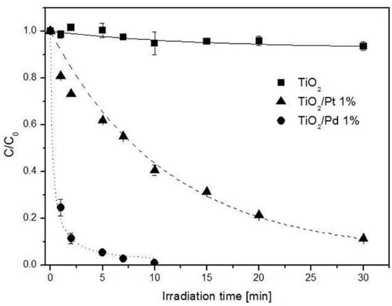 One possible modification that results in improved electronic properties is the modification of catalyst surface with noble metals, such as platinum, palladium, gold or silver. Deposition of noble metal nanoparticles on the surface of TiO2 can improve the degradation of contaminants under visible light due to: (i) increased separation of charge carriers and transport of trapped electrons to oxygen molecules adsorbed on the surface of TiO2 (which prevents electron-hole recombination), (ii) shifting light absorption towards longer wavelengths as a result of surface plasmon resonance (SPR) of metals (collective electron oscillations), and (iii) resulting modification of surface properties of the photocatalyst [19,20,21]. As reported in the literature, platinum (Pt) is one of the most active metals for photocatalytic enhancement due to the formation of the highest Schottky barrier between the Pt particles and TiO2 that prevents the recombination of electric holes and electrons [22]. In the case of palladium (Pd) nanoparticles, high efficiency is explained by high reactivity and selectivity in hydrogenation and Heck reactions that results in higher yields of a conversion to CO2 and long-term photoactivity [23,24].