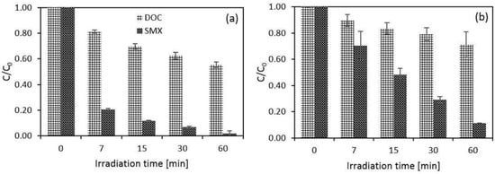 Mineralization was assessed as a decay of dissolved organic carbon (DOC). As shown in Figure 3a, although after 60 min of photocatalytic degradation with Pd/TiO2 no SMX was detected in the samples, observed mineralization was around 45 ± 2%. In the process with Pt/TiO2 (Figure 3b), the same light conditions (the same exposure and duration of radiation) resulted in a decrease of SMX concentration by 90 ± 1%, and at the same time mineralization of 29 ± 10%.