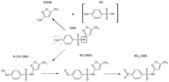 - Majewsky, M.; Wagner, D.; Delay, M.; Bräse, S.; Yargeau, V.; Horn, H. Antibacterial activity of sulfamethoxazole transformation products (TPs): General relevance for sulfonamide tps modified at the para position. Chem. Res. Toxicol. 2014, 27, 1821–1828. [Google Scholar] [CrossRef]