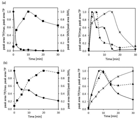 Semi-quantitative determination of SMX and its TPs formed during photocatalytic oxidation with (a) Pd/TiO2; (b) Pt/TiO2 (surface modification level 1%, Ccat = ~ 25 mg/L): (●) SMX, (■) 3A5MI, (♦) N-OH-SMX, (▲) NO-SMX, (*) NO2-SMX.