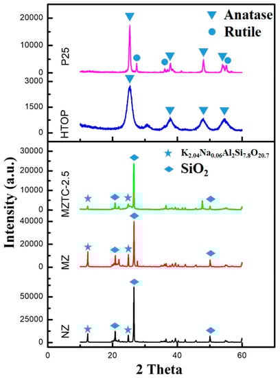 X-ray diffraction (XRD) patterns of the samples are shown in Figure 1. Compared with commercial TiO2 (P25), HTOP prepared by the sol-gel route is proved to be anatase TiO2. The crystallite size of the HTOP and P25 are about 10 nm and 25 nm, respectively, as calculated by the Scherrer equation [17]. The phase compositions of NZ, MZ and MZTC-2.5 are SiO2 and K2.04Na0.06Al2Si7.8O20.7. The intensity of the diffraction peaks of MZ and MZTC-2.5 are weaker than NZ, because the Si in the zeolite skeleton was selectively dissolved and the chemical-bonding water was destroyed. The X-ray pattern of MZTC-2.5 is almost the same as MN and the characteristic peaks of TiO2 are not observed in the diffraction patterns of MZTC-2.5, which may contribute to the low content and small size of TiO2. The absence of TiO2 characteristic peaks indicate that the nanocrystal TiO2 are well dispersed on the zeolite surface and the growth of large-size TiO2 crystallites is prevented [41], which is conductive to improve the photocatalytic activity of MZTC [42].