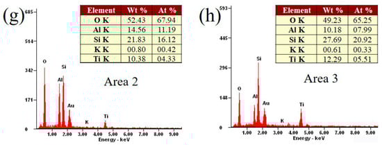 Figure 2a,b show the scanning electron microscopy (SEM) images of P25 and HTOP, respectively. It can be observed that P25 is stacked with nanoparticles with a diameter of approximately 25 nm, which is in accordance with the XRD result. The HTOP is of block shape and the TiO2 particles are compacted after calcination of 400 °C. Figure 2c,d show the morphologies of NZ and MZ, respectively. It can be clearly seen that NZ is formed from stacking plate-like units and the surface is regular and smooth. After modification, the surface of MZ is irregular and rough and many micron-sized cavities can be observed. This is because the impurities in the pore were removed, leading to an open and clear pore system, which contribute to the diffusion and adsorption of the pollutant. Figure 2e shows the morphologies of MZTC-2.5. It can be seen that the microstructures of MZTC-2.5 were almost same as MZ and the agglomeration of TiO2 was not observed on the surface of MZTC-2.5, which was also identified by the XRD results. Combined with the micrograph of HTOP, it can be inferred that the absence of the agglomeration of TiO2 was due to the interaction of TiO2 and zeolite, which inhabits the growth of large-size TiO2 crystallites and the agglomeration of TiO2 particles. Three random points on the surface of MZTC-2.5 were selected for energy dispersive spectroscopy (EDS) analysis, the results of which are shown in Figure 2f–h. The content of Ti at each point exceeded 10%, which confirmed that the nano-TiO2 had already been deposited on the structure of MZTC-2.5. The Ti content of the three points was approximately equal to each other, indicating the uniform distribution of TiO2.