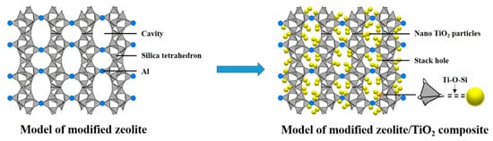 (2) Through the method of saturated infiltration and synthesis in situ, the modified zeolite/TiO2 composite has been synthesized. The nano-TiO2 are homogeneously dispersed in the structure of the modified zeolite at the nanoscale range. TiO2 particles are firmly bonded with zeolite with the force of the chemical bond.