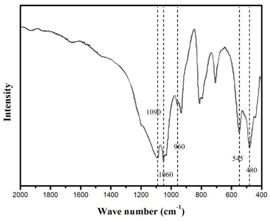 The infrared spectrum of MZTC-2.5 is shown in Figure 5. The middle infrared spectrum region (400–2000 cm−1) displays the features of the chemical bonds of zeolite [45]. The absorption peaks at the range of 400–1200 cm−1 are associated with the Si–O(Si) and Si–O(Al) stretching vibrations inside the (Al,Si)O4 tetrahedrons [46]. The infrared peaks at 1060 cm−1 and 1090 cm−1 are correlated with the Si–O–Si anti-symmetric stretch region of zeolite [47]. The absorption peaks at 400–600 cm−1 are attributed to pseudo-lattice vibrations of structural units [48]. There is a weak absorption peak at 960 cm−1 which is attributed to the anti-symmetric Ti–O–Si stretching modes of a corner-sharing tetrahedral [49,50]. It is confirmed that there is a chemical bond between TiO2 and zeolite. TiO2 particles are firmly fixed on the surface of zeolite with the force of a chemical bond, which is beneficial for the reclamation of photocatalysts.