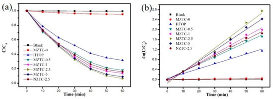 The photocatalytic performance of MZTC was evaluated by the MB degradation experiment. One gram of MZTC-n (n = 0, 0.5, 1, 2.5 or 5) was added into 30 mL MB aqueous solution (50 ppm), then the mixture was stirred and left in the dark for about 60 min to establish the adsorption equilibrium. Once the UV-light (125 W, 365 nm) irradiation occurred, the photocatalysis reactions started immediately. During the photocatalysis process, about 1 mL of supernatant was collected every 10 min and transferred to a quartz cuvette for the measurements of the maximum absorbance at 665 nm. According to the Lambert–Beer law, we get the relationship of C = k′A, so the degradation rate of MB was calculated using Equation (2):
