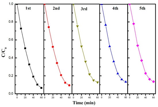 The results of the recycle degradation experiment of MZTC-2.5 are shown in Figure 8. The first degradation rate reached up to 93.6% for MB within 60 min. However, from the second cycle onwards, the degradation rate decreased slightly and gradually become steady. When the tests were recycled five times, the fifth degradation rate was 86.5%, which indicates the excellent recyclability of MZTC-2.5. The slight decrease in degradation rate is probably due to the occupation of TiO2 active sites by remnant MB or the reaction products.