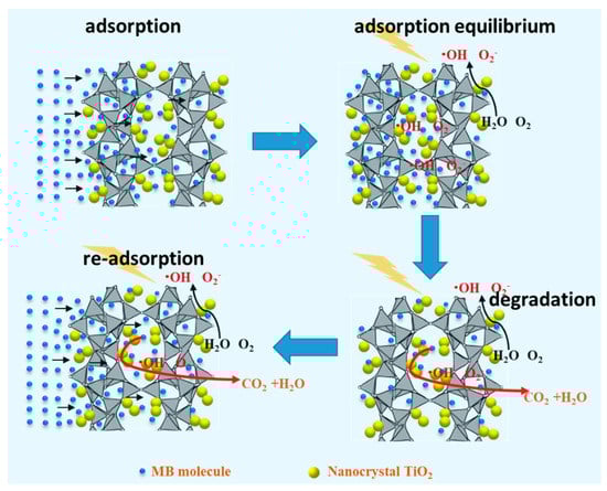 According to the degradation experiment results, the process of the degradation of MB can be divided into several stages in this study. Firstly, a mass of MB molecules migrate to the surface of MZTC-2.5 from the aqueous environment. Because the MB molecules have an effective molecular diameter of about 0.77 nm, which is smaller than that of MZTC-2.5 with an average pore size of approximately 9.27 nm, the MB molecules could transfer to the pores of MZTC-2.5. Due to the huge specific surface area, the adsorption equilibrium was established in a short time and MB could be stored in the large internal surfaces and on the external surfaces of MZTC-2.5, so the concentration of MB around TiO2 was very high. Once the TiO2 particles were illuminated by UV light, electron (e−)–hole (h+) pairs would be generated on the surface of TiO2, which would react with OH− and the dissolved O2 in the aqueous solution in order to generate ROS such as hydroxide radicals (·OH), superoxide radicals (O2−) and hydrogen peroxide (H2O2) in different chain reactions. The MB would be oxidized into inorganic matter by hydroxide radicals (·OH) as shown in Equation (1) [53,54]: