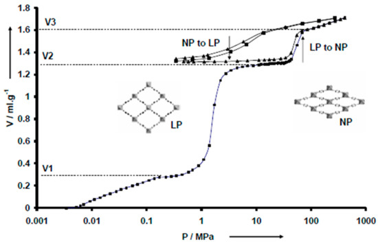 Large pores (LP) to narrow pores (NP) transition in MIL-53(Cr) sample upon intrusion–extrusion of mercury: cumulative intruded volume versus applied pressure. The arrows show the steps that correspond to the LP to NP transition. Squares: first intrusion–extrusion cycle. Triangles: second intrusion–extrusion cycle [59].