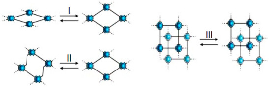 - The dynamic behavior of the inorganic building units (IBU) e.g., Figure 3 (I), is subject to the ordered rotation of the ligand molecules or a hinge motion of the linkers [28,73,74]. These dynamic behaviors result in opening or closing of pores and accordingly affect the loss/uptake of guest molecules. Carboxylate ligands are considered an example for weak IBU since they are capable of switching their binding mode in the so-called kneecap mechanism in which the ligand rotates around the O–O-axis of the carboxylate group.
