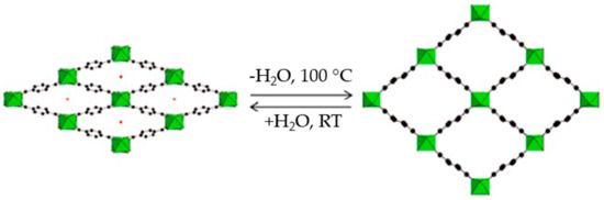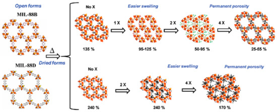 MIL-88 is a prime example of swelling behavior as it exhibits a large breathing behavior resulted from pore size change during solvation and desolvation [79]. It could swell upon immersion in liquids with variations in accessible free cell volumes from 85% to 230% depending on the nature/length of the organic spacer (see Figure 6) [35,85].