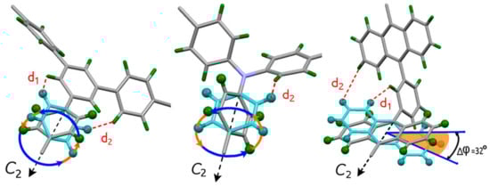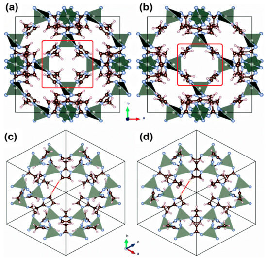 Linker rotation or gate opening behavior is described as a (continuous) transition where the fragments of a linker can rotate around a certain axis. It is important to note that linker rotation is not essentially accompanied by crystallographic phase transitions [52,87]. That kind of dynamic behavior results in a significant change in the inner geometry of the pore, as well as the positions of possible gas uptake [88]. Figure 7 shows the rotational behavior of the aromatic ring within the linker structure around a certain axis within the void.