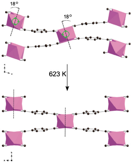 Going back to the prominent example, when inducing a high temperature to MIL-53(Cr) an increase in the rotational motion of the phenyl rings occurs and consequently a transition to the open form. Therefore, changing the nature of the aromatic spacer has a strong impact on the flexible character of these solids [54]. Figure 9 displays thermo-responsive behavior of the Sc–OH–Sc chain in MIL-53(Sc) upon heating to 623 K, as it leads unit cell expansion.